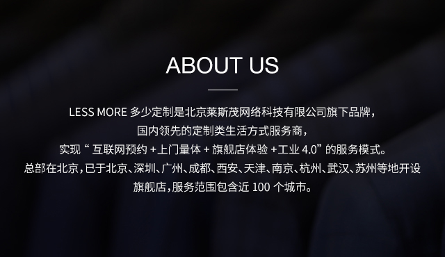 LESS MORE 多少定制是能夠提供男士全品類定制產(chǎn)品的生活方式品牌,對于中國商務男士來說,定制是對西裝最認真的態(tài)度。